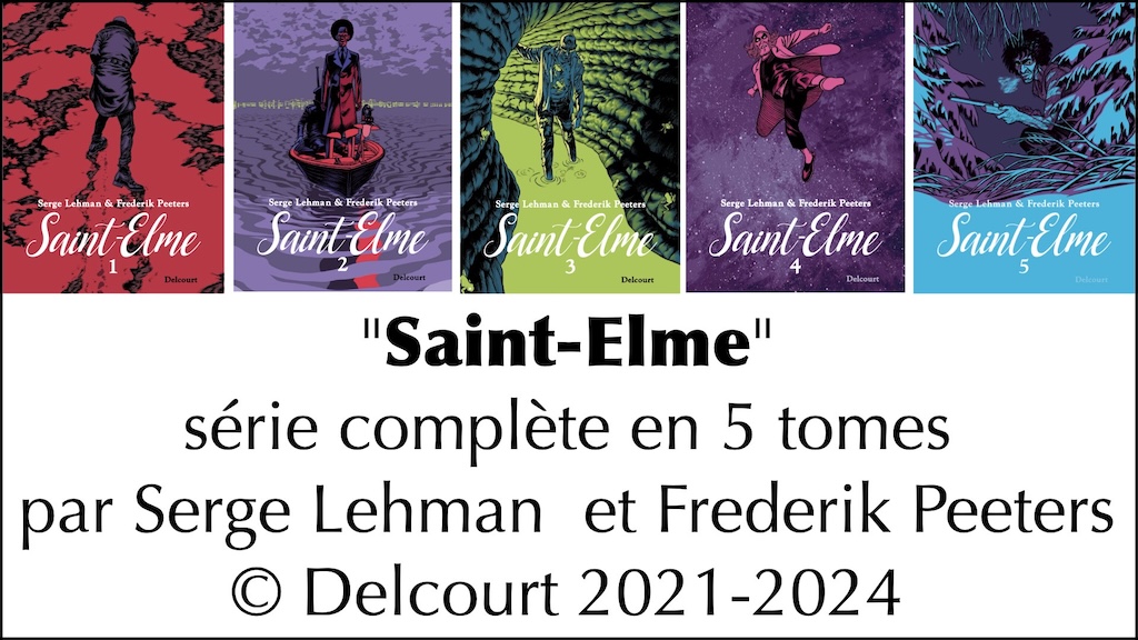 « Saint-Elme » série complète vraiment remarquable en 5 tomes par Serge Lehman (scénario diabolique) et Frederik Peeters (dessin et couleurs géniales) © éditions Delcourt 2021-2024
