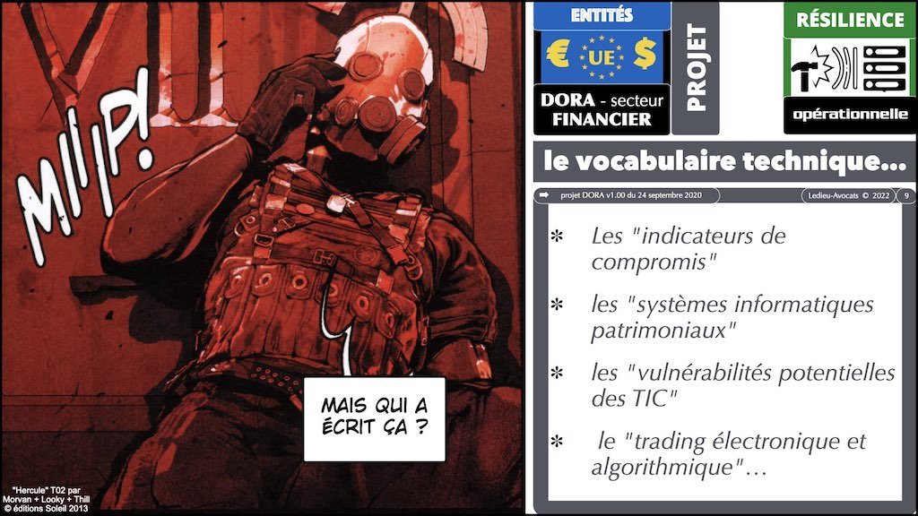 Par exemple ? Les « indicateurs de compromis [sic] » dans la version française du projet DORA pour désigner les « IoC » , les systèmes informatiques « patrimoniaux » [« legacy » dans la version anglaise], les « vulnérabilités potentielles des TIC » , le « trading électronique et algorithmique » pour ne citer que quelques morceaux choisis…