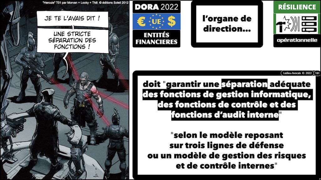 Précision importante dans DORA, la direction devra (ce n’est pas une option) « garantir une séparation adéquate des fonctions de gestion informatique, des fonctions de contrôle et des fonctions d’audit[1] interne, selon le modèle reposant sur trois lignes de défense ou un modèle de gestion des risques et de contrôle internes » .