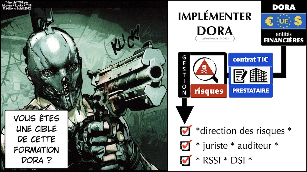Vous êtes Direction des risques ? Auditeur interne ou externe d’une entité financière ? Direction juridique ? DSI ou RSSI en charge des contrats à conclure avec vos prestataires IT (les « prestataires tiers de service TIC » en DORA dans le texte) ?