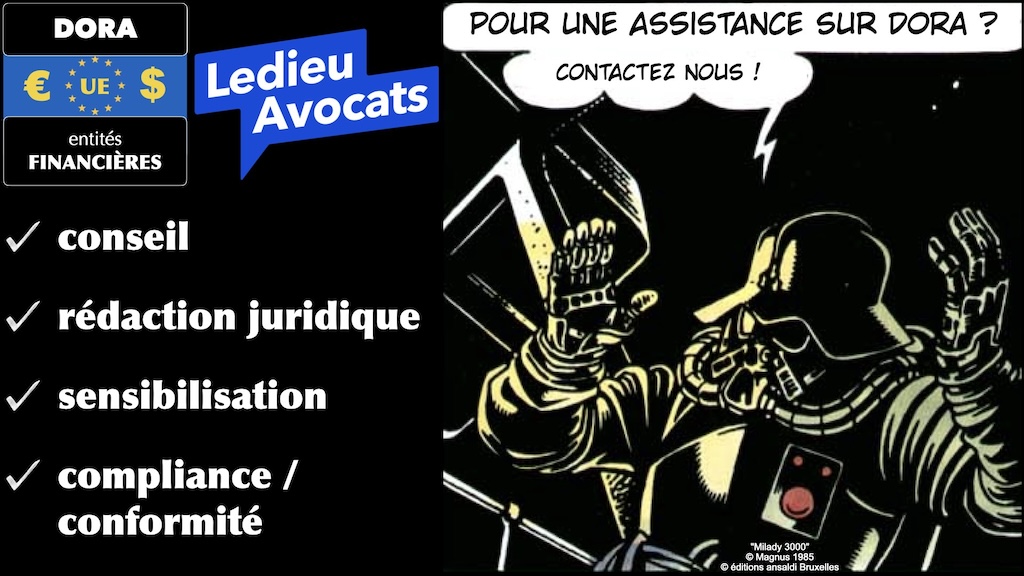 Chaque entité financière peut choisir soit de re-signer chaque contrat conclu (bon courage), soit de conclure un avenant spécifique « DORA » dont les stipulations prévalent sur celles du contrat d’origine.