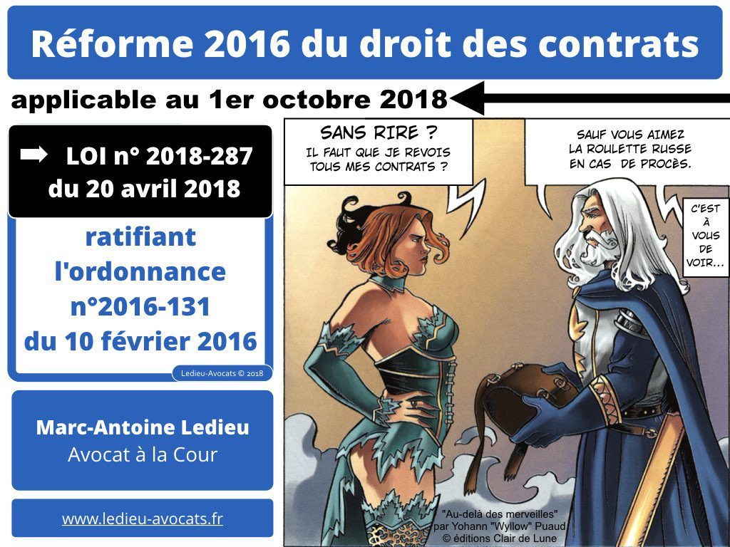 [27 novembre 2018] La réforme 2016 du droit des contrats, il faut bien l’avouer, nous avait pris de court, nous les professionnels de la matière (15 ans qu’on nous la promettait ! ). Nous sommes arrivés à la digérer, tant bien que mal, cette ordonnance n°2016-131 du 10 février 2016 avant son entrée en vigueur officieuse le 1er octobre 2016. Car, pour les juristes les plus respectueux de notre ordre juridique républicain, manquait encore un épisode législatif essentiel : la loi de ratification. Passée largement inaperçue, la loi de ratification n°2018-287 a été adoptée le 20 avril 2018. Ce n’est pas une simple loi de ratification « lettre à la poste », car certains articles du [nouveau] Code civil y sont modifiés. Le sujet de la présentation en BD du jour sera donc (roulement de tambours) « réforme 2016 du droit des contrats et loi de ratification 2018« .
