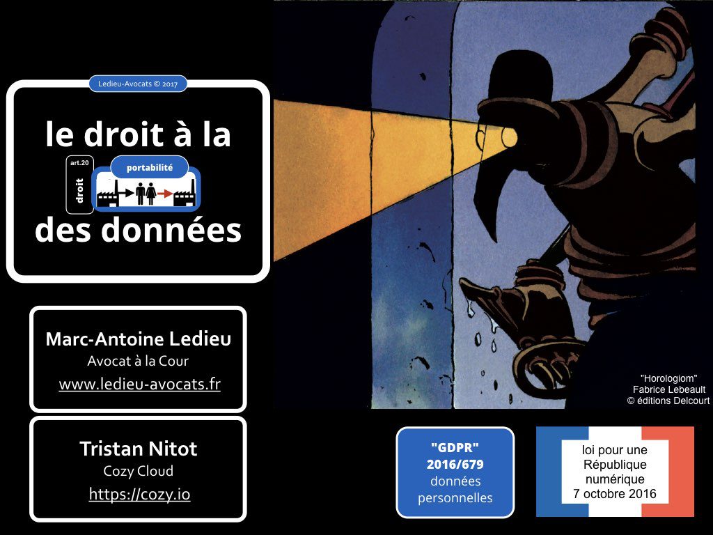 L’originalité de l’étude de ce droit à portabilité des données [personnelles] consiste à voir d’abord les dispositions spécifiques de la GDPR, puis celles de la Loi pour une République numérique du 7 octobre 2017. Dans les deux cas, le dispositif légal est applicable à compter du 25 mai 2018.