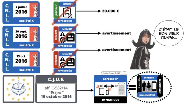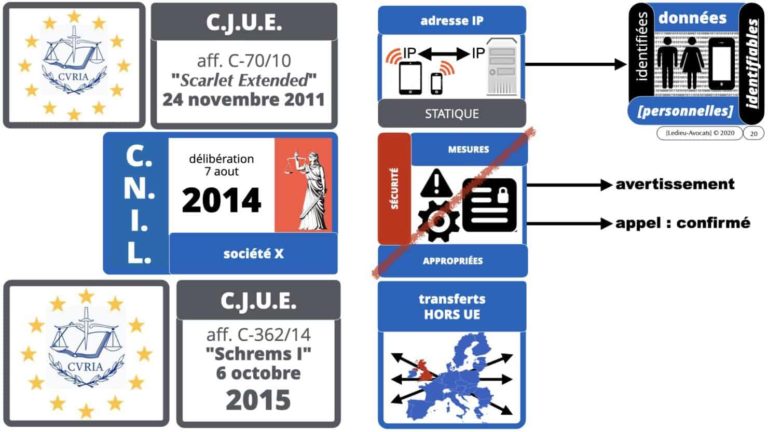 C’est pour cette raison que les arrêts de la CJUE concernant la qualification de « données à caractère personnel » de l’adresse IP fixe (CJUE aff. C‑70/10 « Scarlett Extended du 24 novembre 2011) et de l’adresse IP dynamique (CJUE aff. C‑582/14 « Breyer » 19 octobre 2016 ) restent tout à fait d’actualité et sont parfaitement applicables au texte actuel du RGPD.
