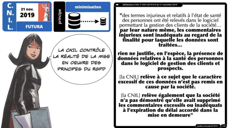 La délibération CNIL n°SAN-2019-010 du 21 novembre 2019 donne un premier éclairage pratique sur le caractère « pertinent » des données collectées et traitées : « rien ne justifie, en l’espèce, la présence de données relatives à la santé des personnes dans le logiciel de gestion des clients et prospects« .