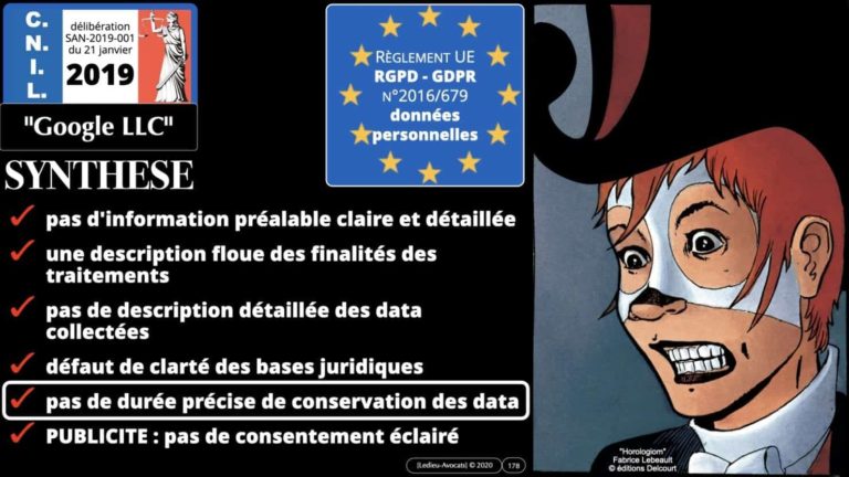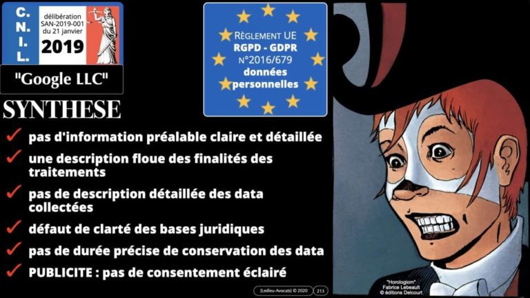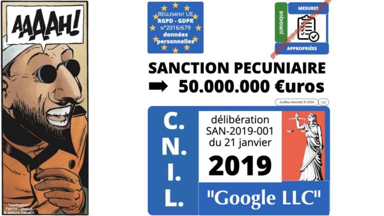 Personne ne sera surpris si je rappelle que ce non-respect du RGPD a conduit la CNIL a condamner Google LLC en janvier 2019 (Délibération CNIL n°SAN-2019-001 du 21 janvier 2019)…