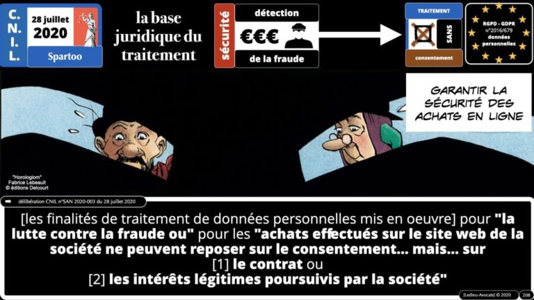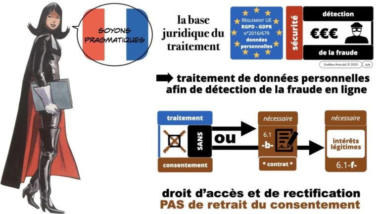 Soyons pratique : un des apports de la jurisprudence récente de la CNIL a été de préciser qu’un traitement de données « afin de détecter la fraude en ligne » est un traitement de données « sans consentement » (mais avec information préalable…) qui peut être soit « nécessaire à l’exécution d’un contrat », soit « nécessaire aux fins des intérêts légitimes » du responsable de traitement (délibération CNIL n°SAN 2020-003 du 28 juillet 2020 – encore elle !!!).