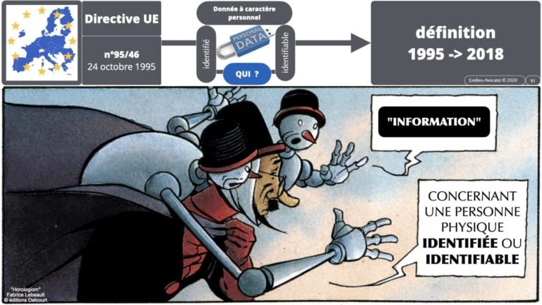 Vous pourrez constater dans les slides que, depuis la loi CNIL n°78-17 du 6 janvier 1978, en passant par le texte de la Directive 95/46 « data protection », jusqu’au RGPD adopté en 2016, cette définition des « données à caractère personnel » a – au final – très peu varié.