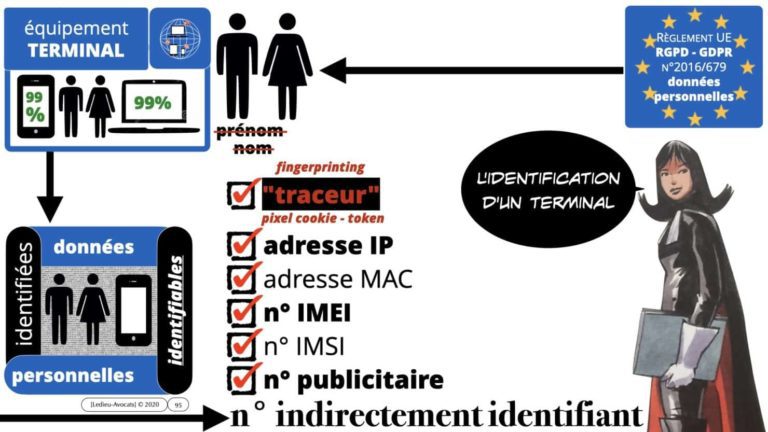 Attention, que l’identification d’un terminal passe par l’accès à un identifiant propre au « device » concerné (adresse MAC par exemple), à un numéro propre à un opérateur télécom (numéro IMSI ou IMEI) ou à une méthode d’identification propre à un opérateur web (« cookie » ou « témoin de connexion », canvas fingerprinting, etc.), dans tous les cas, l’identification du terminal entraine la qualification des données collectées en « données à caractère personnel« .