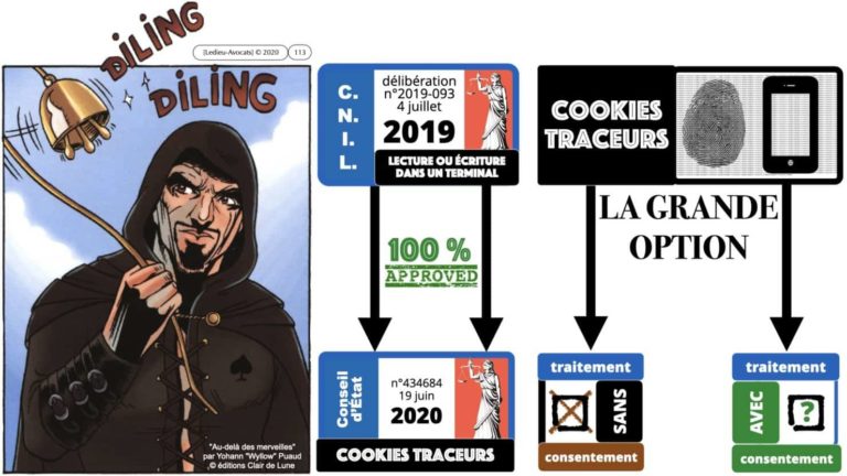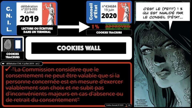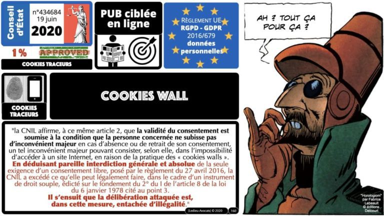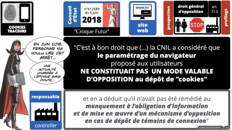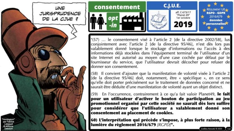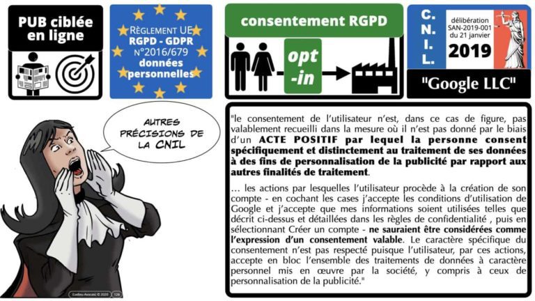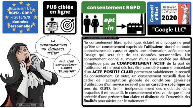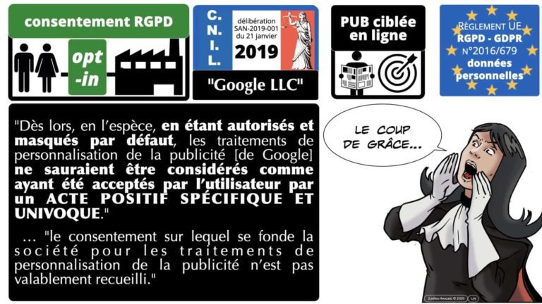 Enfin, n’oublions pas l’arrêt du Conseil d’Etat, également du 19 juin 2020 (arrêt « Google LLC » n°430810) qui valide à 100 % la condamnation de Google par la CNIL de janvier 2019. Vous y lirez que le « comportement exprès de l’utilisateur » passe par un « comportement actif« , c’est-à-dire un « acte positif clair« .