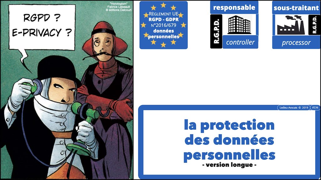 Pas de secret : pour appliquer la GDPR, il faut comprendre si l’entreprise est responsable de traitement (« data controller ») ou sous-traitant (« data processus »), sans oublier le problème de la responsabilité conjointe (le lien http vous renverra sur mon analyse de la jurisprudence CJUE du 5 juin 2018).![RGPD-GDPR-e-Privacy protection des données personnelles des ENTREPRISES [Ledieu-Avocats] droit du numérique et des nouvelles technologies 07 RGPD-GDPR-e-Privacy protection des données personnelles des ENTREPRISES [Ledieu-Avocats] droit du numérique et des nouvelles technologies 07](https://www.ledieu-avocats.fr/wp-content/uploads/2018/12/RGPD-GDPR-e-Privacy-protection-des-donnees-personnelles-des-ENTREPRISES-synthese-bilan-%C2%A9Ledieu-Avocats-droit-du-numerique-nouvelles-technologies-logiciel-Cloud-cybersecurite-blockchain.009-8.jpeg)