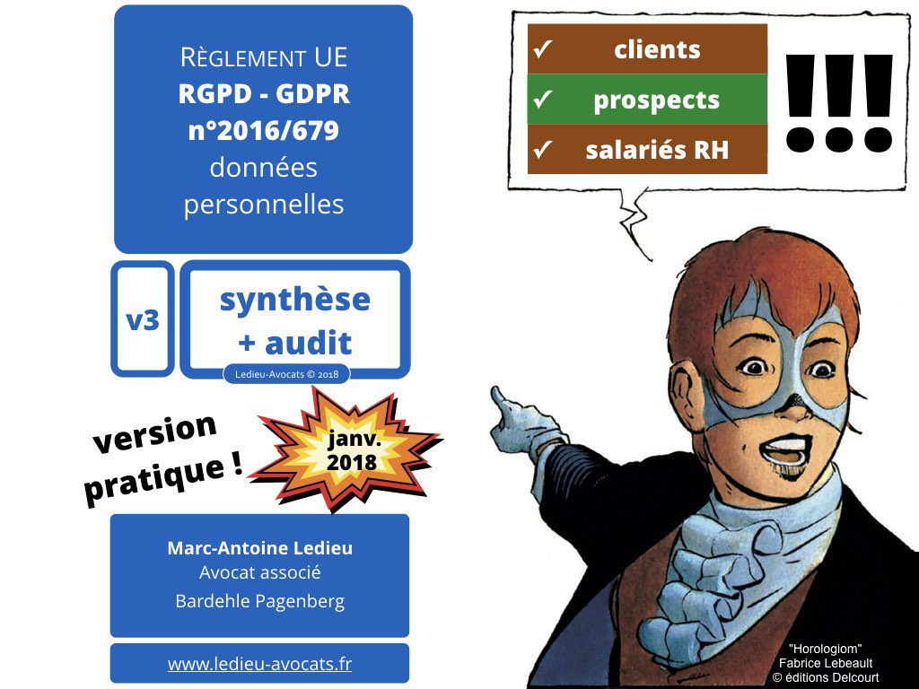 [mis à jour le 26 janvier 2018 -> voir juste en dessous] Le temps passe et nous nous rapprochons de la date (fatidique ?) du 25 mai 2018. PAS DE PANIQUE, pitié, le Titanic n’est pas en train de couler ! Les Autorités de contrôle ont bien compris que les entreprises ne seraient pas toutes (euphémisme) conformes au RGPD dès le 25 mai prochain et qu’elles n’ont pas toujours les moyens à hauteur de leurs missions (interview de Mme Falque-Pierrotin, Présidente de la CNIL du 22 janvier 2018). Comprenez juste qu’il faut vous y intéresser maintenant, et commencer à agir (pour de vrai) entre maintenant et très bientôt… Vous vous interrogez encore sur l’ampleur de la tache à accomplir ? Voici pour vous une synthèse et audit RGPD en v3, qui tient compte de l’ensemble des remarques / commentaires / questions que j’ai entendu depuis quelques mois déjà. Et pour rendre les choses pratiques, nous avons privilégié une approche « clients / prospects / salariés RH » pour chacun des aspects du RGPD.